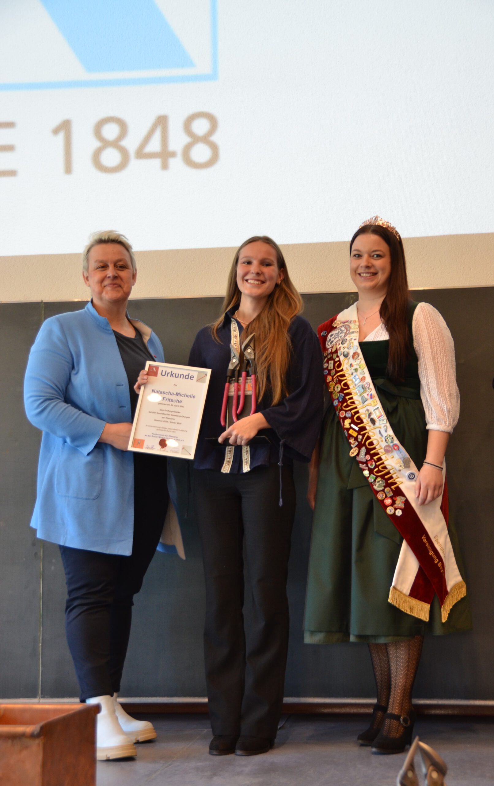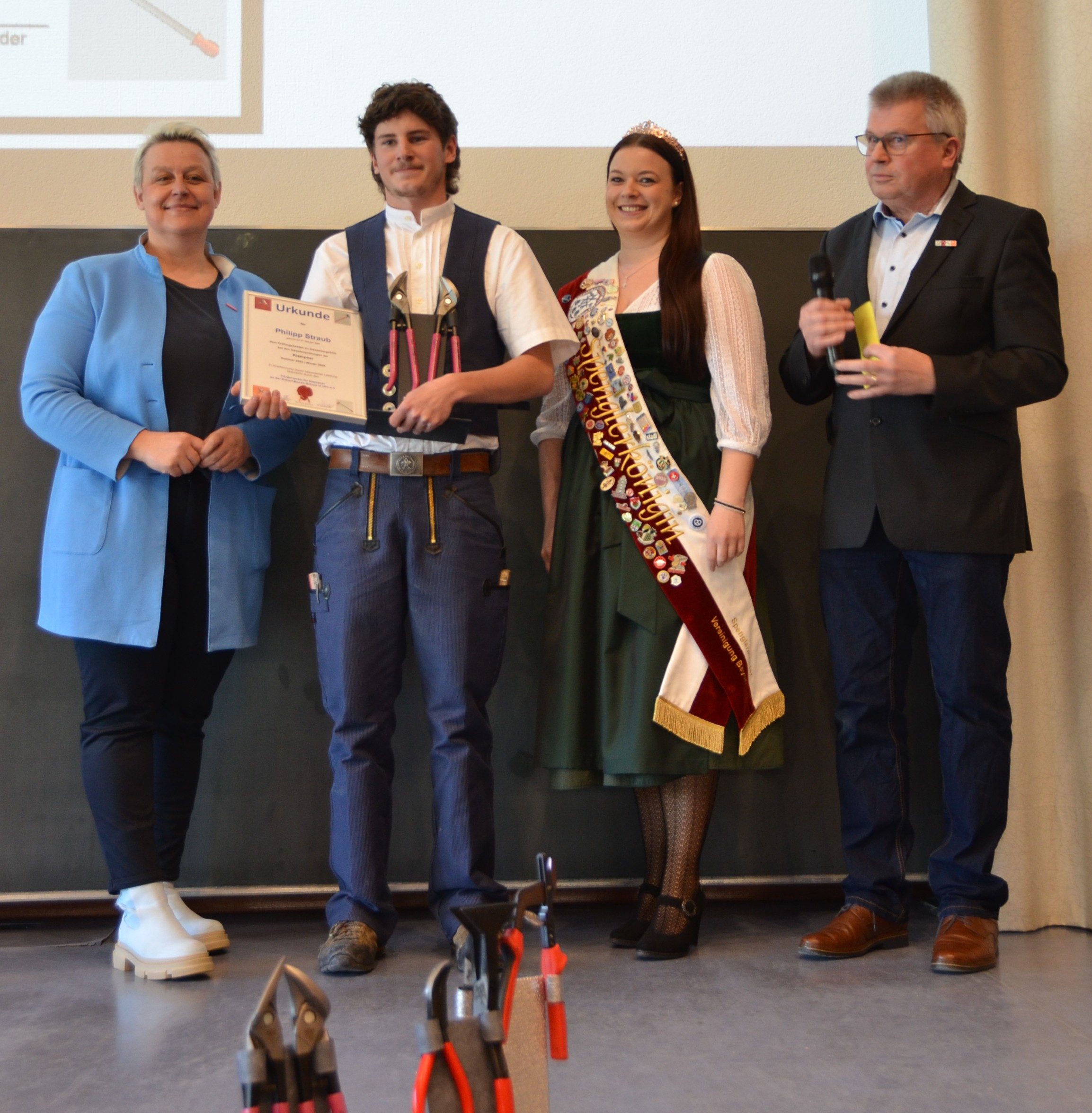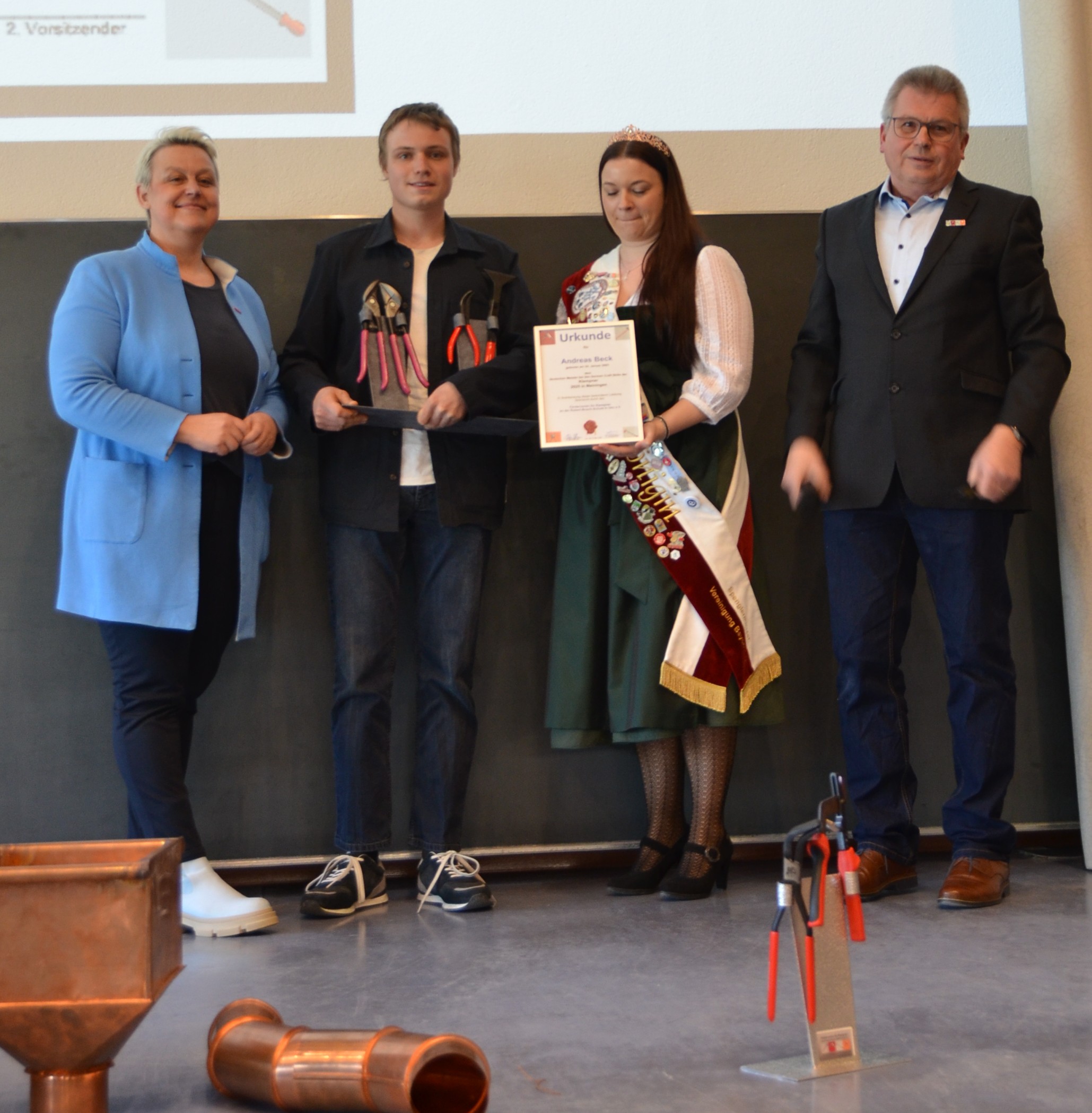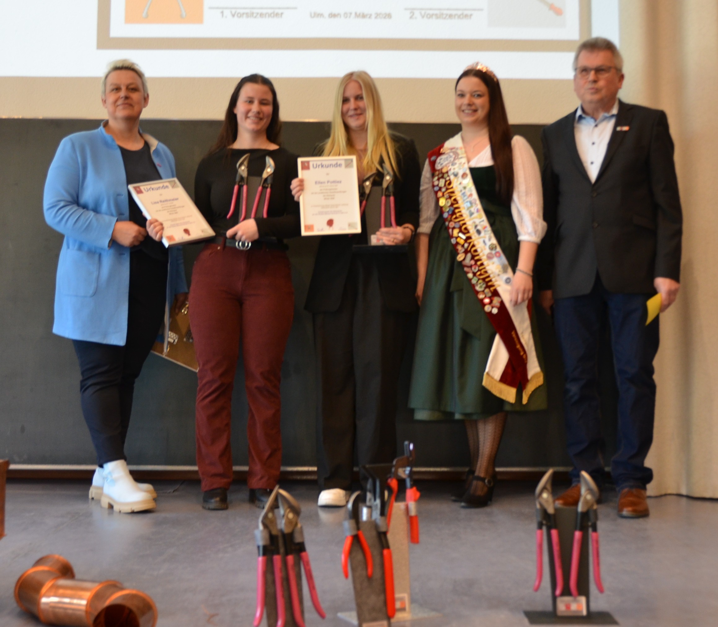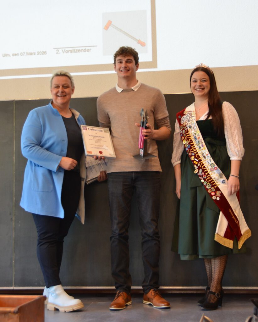 M4KL1T Klasse Ulrich BoyM4KL2T Klasse Marcus EggleM4KL3T Klasse Peter DrewsHurra wir sind Fachkräfte im HandwerkHandwerkskammerpräsidentin Katja Maier übernimmt die Ehrungen Spengler-Königin Marion Roß die 1. überreicht die Siegertrophäe Natascha Michelle Fritsche hat in Theorie die besten Ergebnisse erzielt Ausbildungsbetrieb Fa. Barensteiner aus Wangen i.A.Christian Keck mit dem besten Prüfungsstück im Sommer 2025 Ausbildungsbetrieb Fa. Dieter Keck in HermaringenPhilipp Straub mit dem besten Gesamtergebnis der Prüfungen Sommer und Winter 2025/26 Ausbildungsbetrieb Fa. Heiko Schad Kolbingen Ellen Pottiez Ausbildung bei Fa. BeRu in Ettenheim Lisa Reithmeier Ausbildung Fa. Steinmetzt Güglingen hatten Punktgleich die besten Werkstücke in der Winterprüfung 2026Andreas Beck überzeugte beim Landeswettbewerb für Baden-Württemberg und holte sich auch diesen Titel des deutschen Meisters bei den deutschen Meisterschaften im Handwerk in Meinigen. Ausbildungsbetrieb Fa.Müller E.K. Lukas PustelnikFür Quentin Gramm, den deutschen Meister 2024 gab es in Salzburg bei den Euro-Skills die Silbermedaille. Was für eine Erfolgsgeschichte HWK-Präsidentin Katja Maier und Spengler-Königin Marion die 1. überreichten Quentin die Urkunde sowie eine WerkzeugtrophäeImpressionen zu den Preisträgern